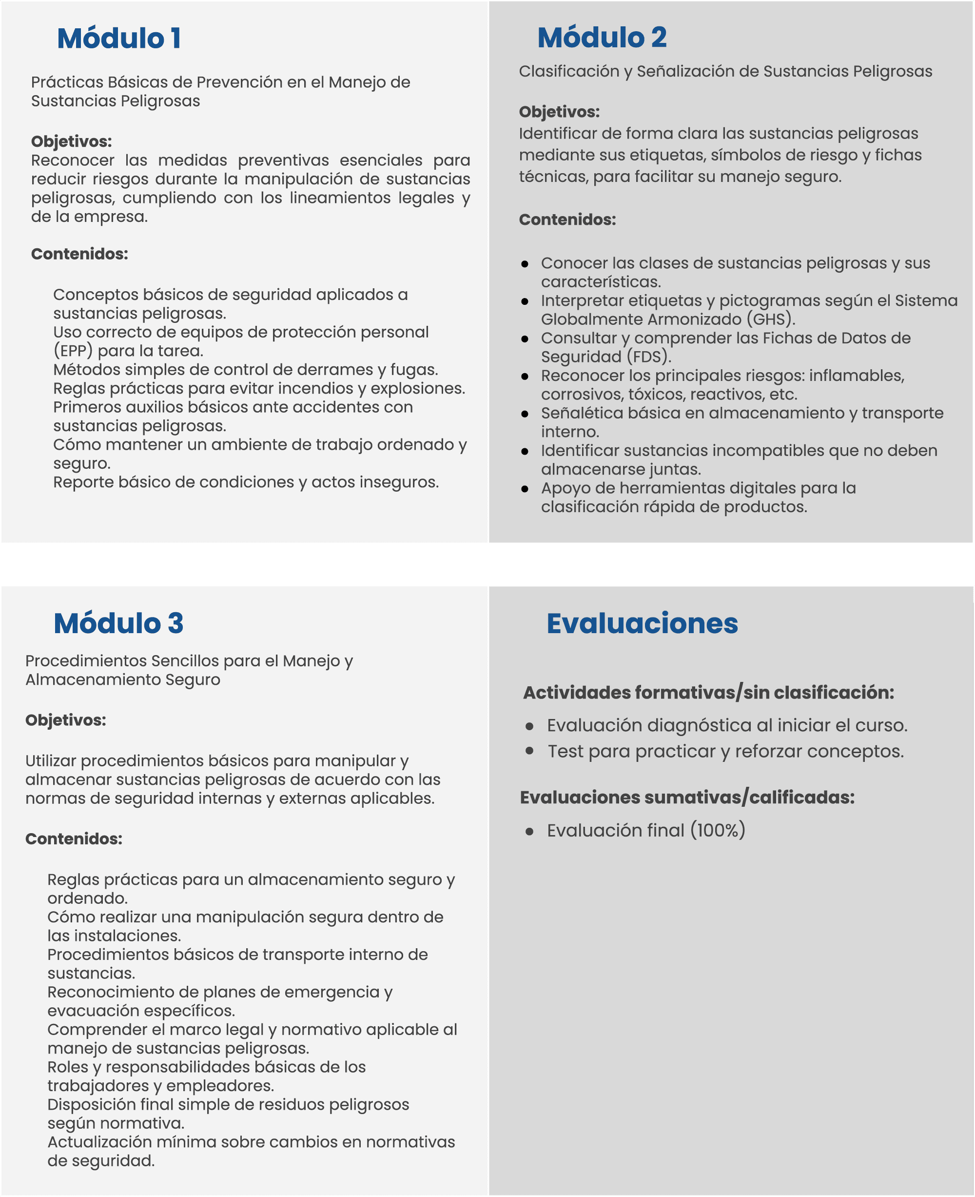 Dirigido a Técnicos de áreas químicas, responsables de residuos peligrosos, jefes de laboratorios químicos, encargados de bodegas de productos químicos, profesionales de prevención de riesgos, técnicos de residuos líquidos y sustancias peligrosas, y toda persona que participe en tareas relacionadas con la manipulación o almacenamiento de sustancias peligrosas en su lugar de trabajo.